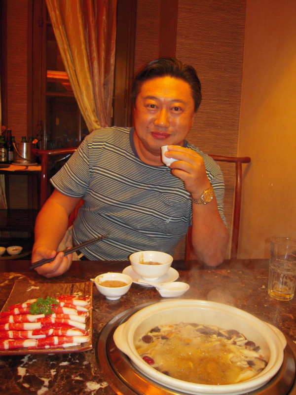これはまた旨いこと。いろんなキノコから好きなものを選んでどっさりと鍋に入れる。鍋は漢方を煮込んだ薬膳スープ。さらに烏骨鶏も入れ、グツグツ煮えてきたら特製ダレにつけて食べる。
