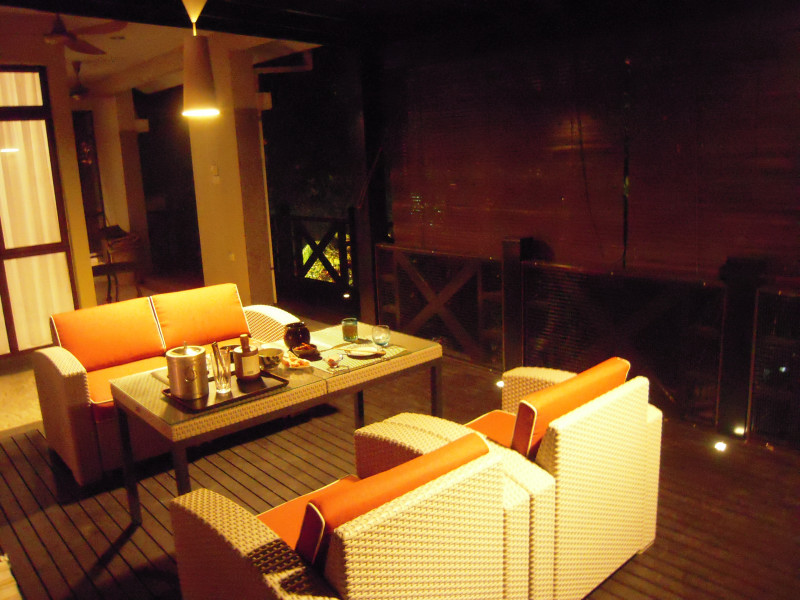 新居の元オーナーがイギリス人だったこともあってか、空間デザインはかなりその独自のコンセプトを反映している。一つ大きな特徴は、トロピカルな自然との接点の最大化である。リビング機能を室外へ移し、大きな木造デッキテラスにソファーセットが設けられている。