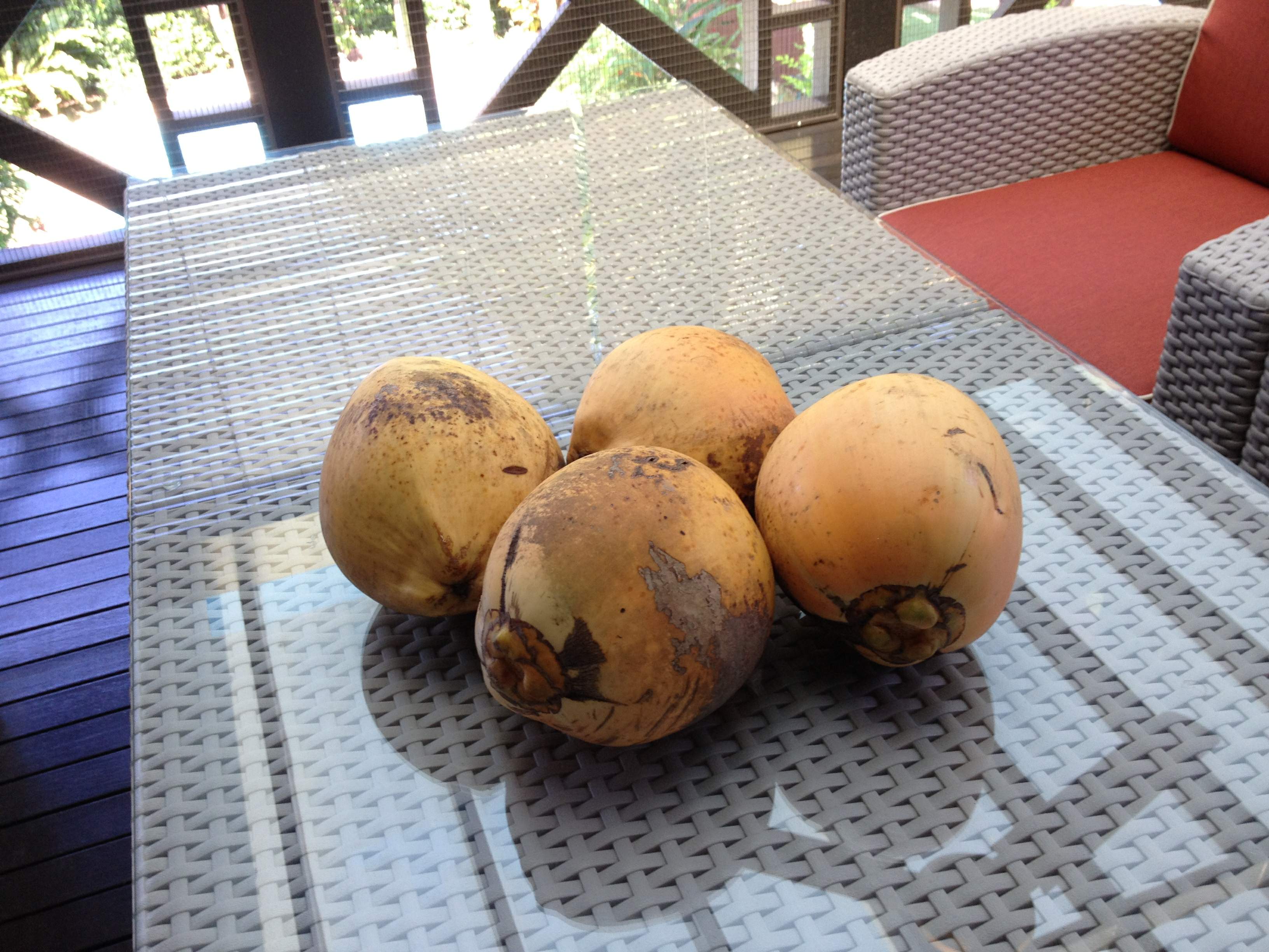 と思いつつ、今朝庭へ行ってみると、椰子の実がたくさん落ちていた。昨日の「揺さぶり」が効いたのか。なるほど。今日も断食しようかな・・・。