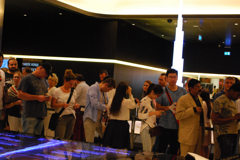 ブルジュ・ハリファだけは登ってみた。世界一高いビル(全高828メートル、軒高636メートル)としてその下段展望台(124階)に登るために、事前にウェブで前売券を購入すれば、通常時間帯が125ディルハム(約4000円)、夕刻サンセットのプレミアム時間帯は200ディルハム(約6400円)という値段設定である。
