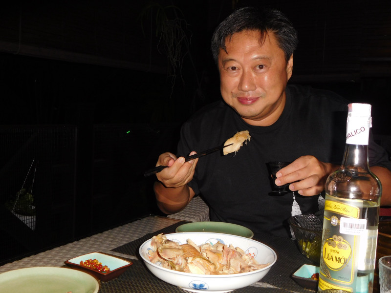 日と月の連続2日、夕食は塩釜チキン。赤道直下の心地よい夜風のなか、ベトナムから仕入れた米酒に、イポーの塩釜チキン。これ以上ない完璧な南国モードでまたもや酔ってしまった。