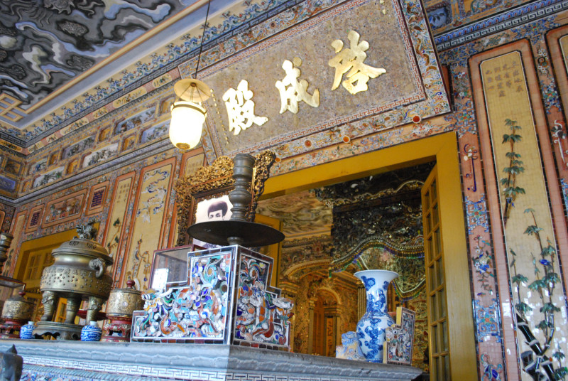 啓成殿の内部には、金箔を押した青銅のカイディン帝の等身大の像があり、下に皇帝の遺体が安置されている。