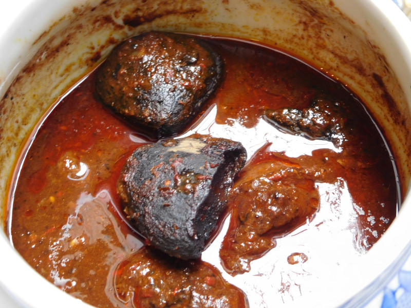 メインは、「アヤム・ブア・クルア」(Ayam Buah Keluak)。クルアの実と鶏肉のニョニャ風煮込み。クルアの実、英語では「ブラック・ナッツ」と書かれているが、実は初めて食べる。食べるよりも薬味的な存在であって、固い殻から実をスプーンでくりぬいてそれをソースと絡めてご飯にかけ、混ぜて食べるのである。クルアの実は実に香ばしい。マレー的な香りが溢れる薬味である。肉の煮込み料理と相性抜群。