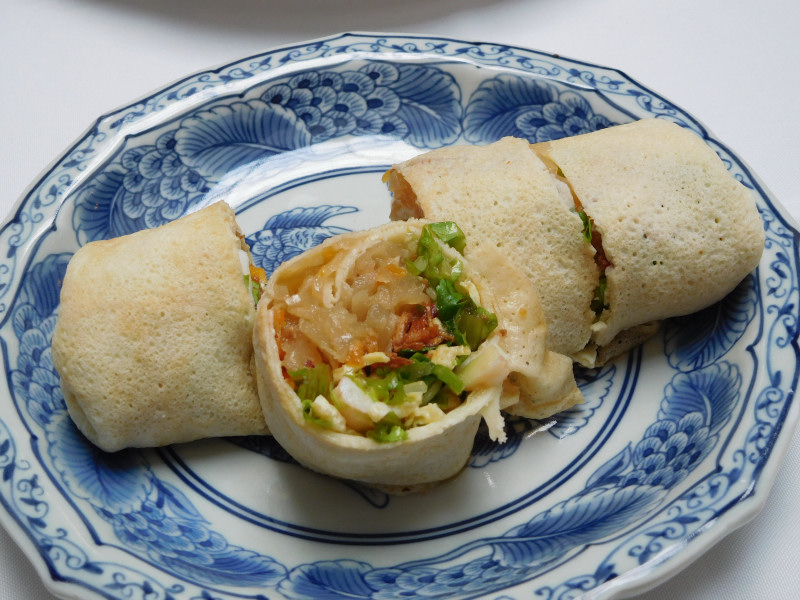 前菜には、ポピア(Popiah)。名前は福建語の「ポッピァン」(薄餅)から来ているのだろう。確かに台湾の屋台でも似たようなものを食べたことがある。海鮮や干し大根の煮物、卵、レタスなどの具材を味付けして春巻風の薄い皮で巻いた、いわゆる「ニョニャ風準生春巻き」(生の具材だけではない)だ。皮がモチモチして旨い。