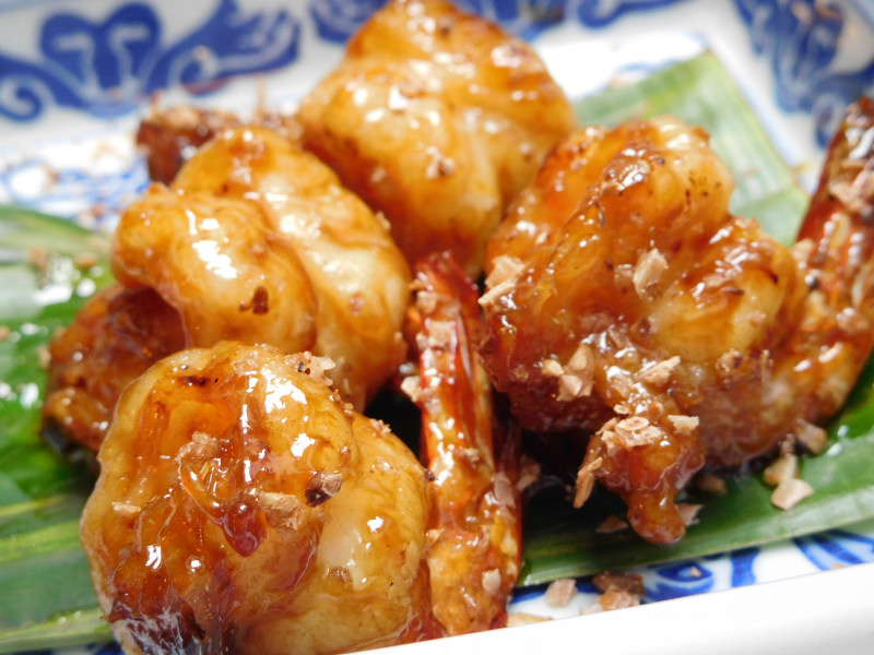 続いてエビの甘辛炒め。若干甘いような気もするが、まあ、フルボディの赤ワインには意外とよく合う。