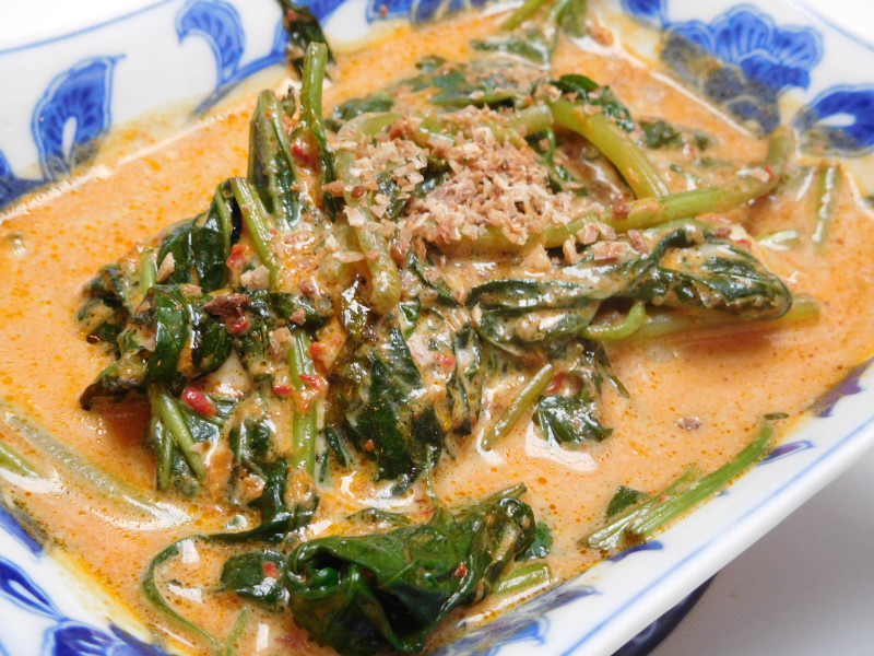 最後の野菜は、ジャガイモの葉のココナッツカレー風味炒め。これもまた中華の南洋風で素晴らしい。