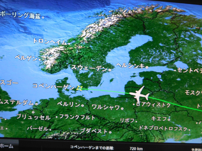 スワンナプーム国際空港で3時間強の乗継ぎ。日付が変わって、8月8日(火)未明1時20分バンコク発のタイ国際航空TG950便に乗り込み、デンマークのコペンハーゲンへ向かう。機内で遅めの夕食を取ってすぐに就寝。