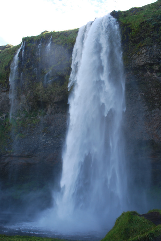 セリャランスフォスの滝。最大落差は60メートルを超える。滝の裏側にはくり抜かれたような窪みがあり、小道が造られており、歩いて滝の裏側に入ることができる、というのが特徴だ。