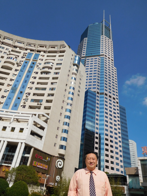 背後左が新世紀広場、右側の高層ビルは事務所が入居する万都中心