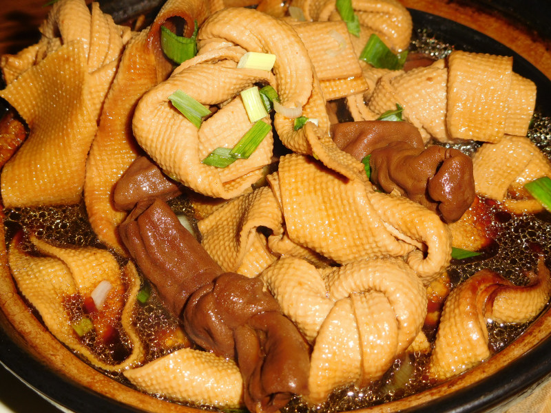 「小腸百葉結」。ホルモンと押し湯葉の醤油煮込み。これも典型的な江南料理。ホルモン大好きな私だが、中国では食の安全を考慮してあまりホルモン系に手を出さないが、ついついて誘惑に負けてしまう・・・。