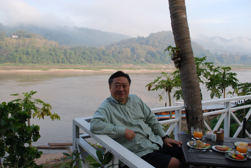 朝靄のかかったメコン川を眺めながらの朝食は、なんともいえない非日常的で贅沢な時間だ。都会生活者にとってこの種の非日常的さを求めて旅に出るわけだ。
