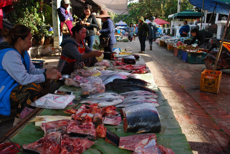 市場には露天が多数集まり、野菜やメコン川で獲れた魚が並ぶ。ラオスはインドシナの内陸国である。魚といえばまず川魚。それにしても種類が多い。どんな料理にされているのか、興味が尽きない。