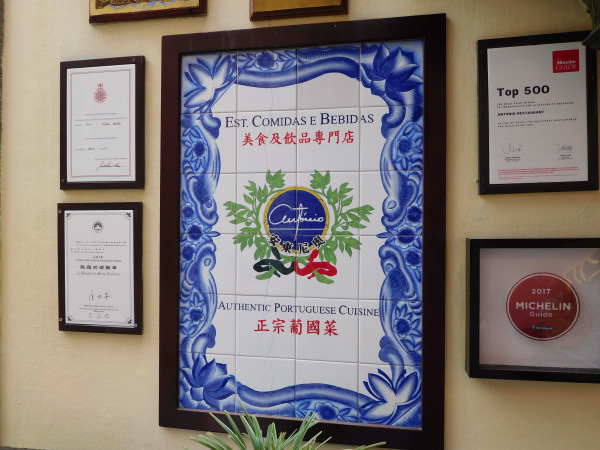 以前コロアン島にある名門ポルトガル料理店「エスパソ・リスボア」のオーナーシェフをしていたアントニオ氏が出した新しい店である。マカオ政府などからも勲章をもらっている高級店として、重厚感に満ちた風格や貫録は確かに感じられる。