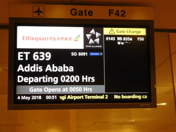 5月3日(木)深夜23時クアラルンプール発のエチオピア航空ET639便で、まずはシンガポールへ2時間弱の立ち寄り。日付が変わって翌未明2時、飛行機はシンガポールを飛び立ち、アフリカ大陸に向かう。