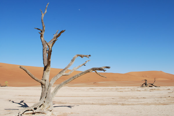 デッドフレイ(Dead Vlei)という砂漠と枯れ木の有名な場所がある。もともとオアシスの水が流れていていたところだが、砂丘の動きによって水が遮断されると、木々が死に、枯れ木になる。