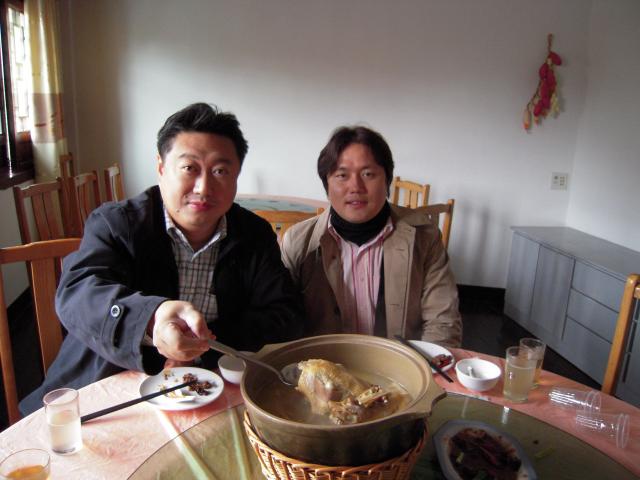 私は、どこに行っても、その地方の料理を食べますので、名物料理の紹介を老板娘(ローバンニャン)にお願いしました。「ちょっと待ってね」と、自慢げに冷凍庫から出してくれたのは、雉(キジ)らしい野鳥。全身の羽毛がついたまま、猟銃に撃たれた傷口も流れ出た血痕もそのまま、凍り付いている。まるで剥製のようでした。