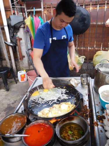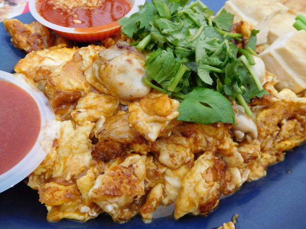 これに似て、蚵仔煎(オアチェン)という台湾の代表的な小吃がある。牡蠣入りのオムレツである。台湾版は、鉄板の上で油を熱した後、小粒の牡蠣と鶏卵を炒め、白菜または春菊を入れ澱粉水で綴じ、上から甘辛いたれをたっぷりとかける、というようなものだが、ここマレーシア版はやや違う調理法を取っていた――。