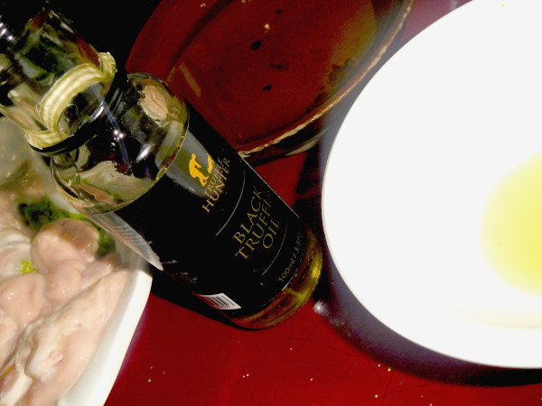 火鍋には、ごま油でいただくが、さらに私は特別にトリュフオイルをも持参。ごま油は口に膜を作ってくれるから、辛さを和らげ全体的に味をマイルドにする作用がある。さらにトリュフオイルが加わると、その独自の香りが具材の旨みを引き立て、辛さと旨さのバランスが一段と良くなる。