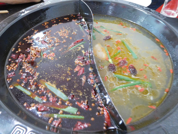 友人の特別配慮で予約してもらった窓側の一等席につくと、早速注文。火鍋の注文は、鍋底スープから始まる。本日は 「麻辣」と「老鴨湯」の鴛鴦(仕切り鍋の2種類スープ)にする。「老鴨湯」も出汁が効いていて美味しいし、同行の初心者日本人友人には「逃げ道」、辛くない選択を一応残しておこうという意味もあった。