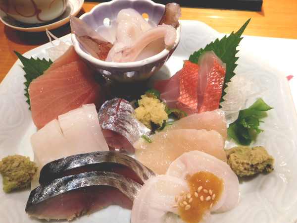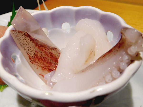 盛り合わせも全品目合格。特に、生げそがうまい。イカの場合、胴体よりも触手、つまり獲物に巻き付いたり伸び縮みしたりするために筋肉が発達している。新鮮なイカのげそほどうまいものはない。ねっとり感とコリコリ感が渾然一体となってたまらない。