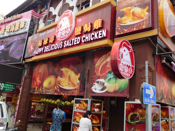 次は、「塩鶏」。中国語(広東語)では、「塩焗鶏」(イェンゴッケイ)という。客家料理の丸鶏の塩蒸し。これもイポーの名物だが、ただレストランよりもお土産として売られることがほとんど。塩鶏専門店の店頭には通常レストランが併設されていない。そこで買った鶏は家に持ち帰って簡単な過熱加工を施して食べるか、あるいは近隣のレストランに持ち込んで食べても問題ない。
