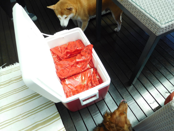 2時間ちょっとのドライブで、午後14時、自宅に帰着。早速も愛犬たちが匂いを嗅ぎつけてやってくる。よほど良い香りしていたのだろう。
