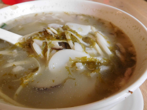 もう一種類の縁起物は「年糕」(ネンガオ)。どちらかというと、日本の餅により近い存在ではないかと思う。これも炒めたり、蒸したり、あるいはスープやお粥系にしたり調理方法は多種多様である。あっさりとした「雪菜年糕湯」を注文。細かく刻んだ高菜の漬物と豚肉を具材とする薄い塩味の餅スープで、「食い倒れ点心ツアー」を締めくくるには最適な一品だ。