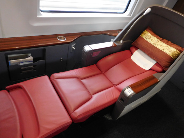 席間の距離も必要以上に取られている。座席は完全フラットベッドになるので、長時間乗車もほとんどストレスがない。飛行機のビジネスクラスに比べても何ら遜色ない。
