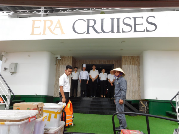 荷物は大きいスーツケースを港のクルーズオフィスに預け、残りの荷物もタッチすることなく、すべてスタッフが船内の部屋まで運んでくれるので、身軽。乗船すると、まずレストランに集合し、日程や乗船中注意事項の説明を受ける。ベトナム人スタッフはみんな英語が流暢。コミュニケーションの支障はまったくない。