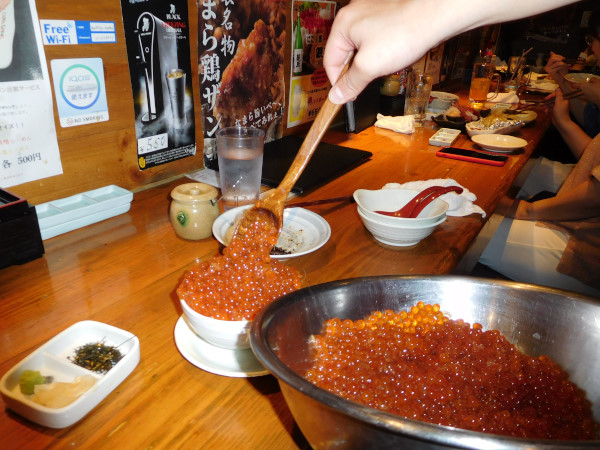 名物はつっこ飯(つっこめし)。盛りの良いいくら丼のことだ。「おいさー!おいさー!」と威勢のいい店員の掛け声は客がストップをかけない限り、いくらが丼からこぼれる寸前まで行われる。もちろん限界までストップをかける客はいない。