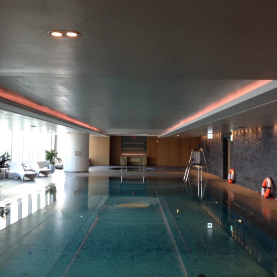 最先端のマシンがあるし、使い心地も良い。スイミングプールは室外がメンテナンス中で、室内のしか使えないが、これもなかなか素晴らしい。誰も泳いでいないし、貸しきり状態だ……。