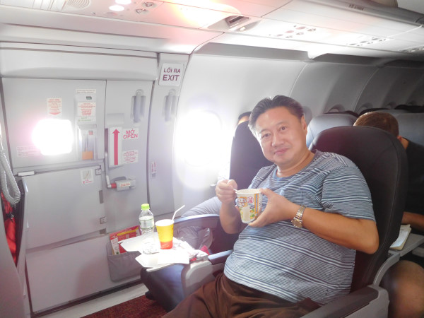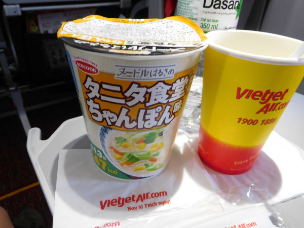 同じLCCでもエアアジアと違って、ベトジェットは食べ物の持ち込みを容認してくれる。先日タニタ本社訪問時にいただいたカップ麺の出番になる。親切なCAさんが熱湯を入れ、座席まで持ってきてくれるのが嬉しい。