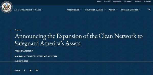 米国務長官のマイク・ポンペオ氏は2020年8月5日、「中国共産党(CCP)などの悪意ある攻撃者から国民と企業を守るトランプ政権の包括的なアプローチ」として、「クリーンネットワーク(Clean Network)」プログラムの立ち上げを発表しました。プログラムは、次に掲げる5つの取り組みから構成されています。