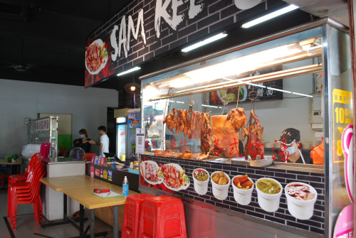 まず、クルアン郊外にある「Zenxin」という農場で卵とフルーツを仕入れる。そこから市内に入って、コーヒー工場近くの中華屋で昼食。この手の店は、メニューが非常にシンプル――「焼味飯」だけ。ローストダック、ローストチキンとチャーシューの3種盛り飯を注文。