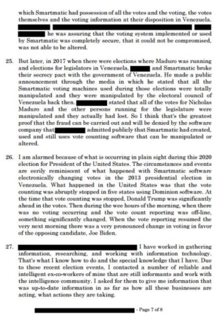 「まず、私は、証明できないことを言わない。次に言いたいことは、ソフトウェアはドミニオン・システムだけでなく、他の投票マシンにも使えること。問題はソフトウェア。トランプの票はあるフォルダに入れ、そのフォルダを削除すれば済む。では、なぜ人々がドミニオン・システムを買ったか、なぜ買ったか。厚顔無恥だからだ。ドミニオン投票システムを購入した州はすべて調査しなければならない。関係者が購入からリベートを得た証拠もある」