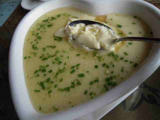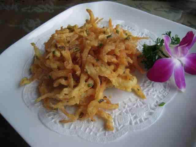 まず、銀魚料理、から揚げと茶碗蒸しの二品を注文しました。この魚は、体長3~5センチしかなく、細くやわらかくて体が透き通っています。新鮮な魚ほど、腹部のはらわたが透き通って緑っぽく見えるそうです。とても、淡白な味です。