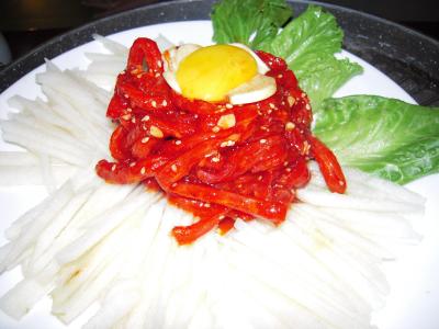 まずは、ユッケ(35元)。本来この一品は庶民の味とはいえないが、どうしても食べたかったので、注文した。血抜きした生の牛肉を細切りにし、松の実やゴマ、ネギなどの薬味と、醤油やごま油、砂糖、コチュジャン、果汁などの調味料で和え、中央に卵黄を乗せ、最後にナシやリンゴの千切りを添えて供するのが、ユッケだ。