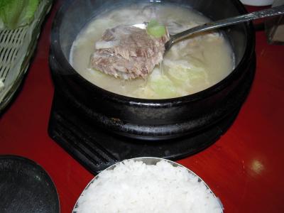 最後は、ソルロンタン (설렁탕)。牛の骨や各部位の肉、舌、内臓を大きな鍋に入れ、水で10時間以上煮立て、乳白色のシンプルなスープになるはずだが、この店は、看板料理としながらも、インパクトのある味ではなかったのが残念だった。