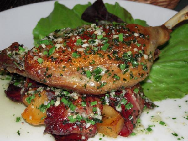さっそく、いただきます。肉のジューシーさと柔らかさがしっかり保たれているのに、皮がパリッと焼きあがっている。バランスが素晴らしい。ダックコンフィを注文して、あることを言い忘れた。ドロドロのデミグラスソースで風味が壊されるのが嫌で、ソースの別皿サーブにしてほしかった。でも、出てきたソースは、薄口。何の嫌味もない。骨にそってナイフを入れると、皮がパリッと音を立て、ほどよい柔らかい肉が滑らかに骨から分離された。皮のクリスピーな食感と肉のジューシーな味わいが口中で絡み合い、美食万歳の一幕を演じる。ブラボー!