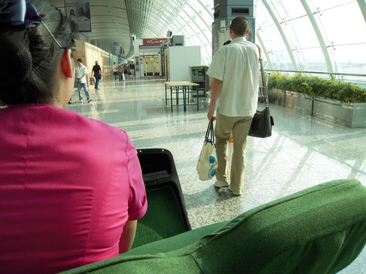 広州行きの上海航空便は空いているようで、めでたく、足元の広い、非常口の座席を確保。次、セキュリティーチェックには長蛇の列。並んでいると、前方の異変に気付く。20代の小柄な小姐が、様子を伺いながら、スッと素早く列に割り込んだ。