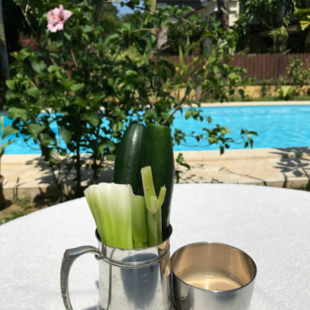 土曜日も引き続きダンチ(Dunch=Lunch+Dinner)。午前8時から11時までは庭でリゾートしながら軽く仕事(ネット情報収集)。11時から2時間水泳。13時からプールサイドでDunchモードに入る。