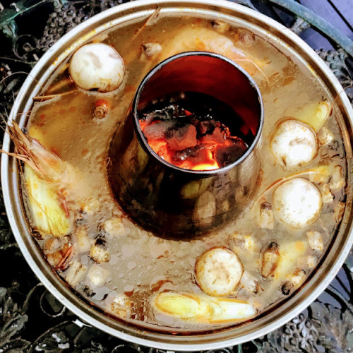 焼肉こん炉を使って火を起こしてから、真っ赤に燃えている炭を煙突火鍋へ移す。そのほうが一気にスープが沸く。さあ、いただきましょう。何と美味のこと。やはり炭火が電気やガスと違う。具材の風味が丸みを帯び、炭の香りに包まれている。お酒は中国の白酒が合う。