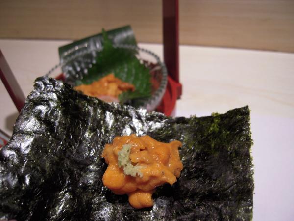 今日のお薦めはと尋ねると、雲丹。パリパリと炙った海苔の上に黄金色の雲丹を乗せ、さらにちょびっと柚子こしょうを乗せると、もう、そこは天国への入り口だ。パリッ、ヌルッ、ホワァ~、またもや、ビリビリ感電状態に陥って行く。ここまでくると、放縦な欲望の虜となり、甘美な罪悪感に包まれる我が身がもう制御不能状態。