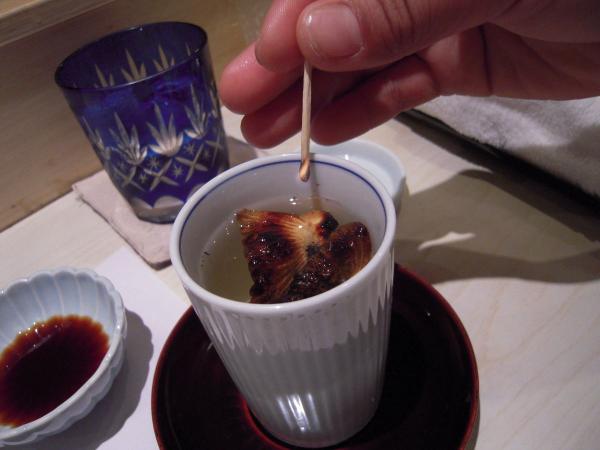 冬の海はさぞかし寒い。そこで、ひれ酒の出番だ。例によって火をつけて蓋をして蒸して飲むのだが、なぜ火をつけるのか、いまだに不明だ。アルコールを飛ばすためか、香りを引き立てるためか、それとも、単なるパフォーマンスなのか、よく分からないが、とにかく頂こうと、あっという間に一杯飲み干す。体がポカポカ。炙ったひれも香ばしくパリパリと食べたところで、「しまった」と、注ぎ酒を忘れていた・・・