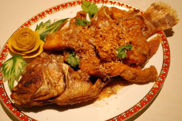 そして、テラピアという魚料理。テラピア(Tilapia)とはスズキ目の魚である。日本にもあるが、あまり知られていないようだ。元々高級魚ではなく、終戦後の食糧危機をしのぐためにタンパク源として注目された魚であった。流通名は「イズミダイ」、又は「チカダイ」と呼ばれ、養殖されている。味や食感が鯛に似ているが、外観はクロダイにそっくり。タイにこのテラピアが入ったのは、実は日本と大変深い関係があった。発端は、皇太子明仁親王(当時)がタイ国王にテラピアを50尾贈り、テラピアの養殖を提案したことにあった。タイ政府はそれを受け、タイでは広くテラピアが食されるようになったそうだ。このエピソードにちなみ、タイでは華僑により「仁魚」という漢字名がつけられたという。