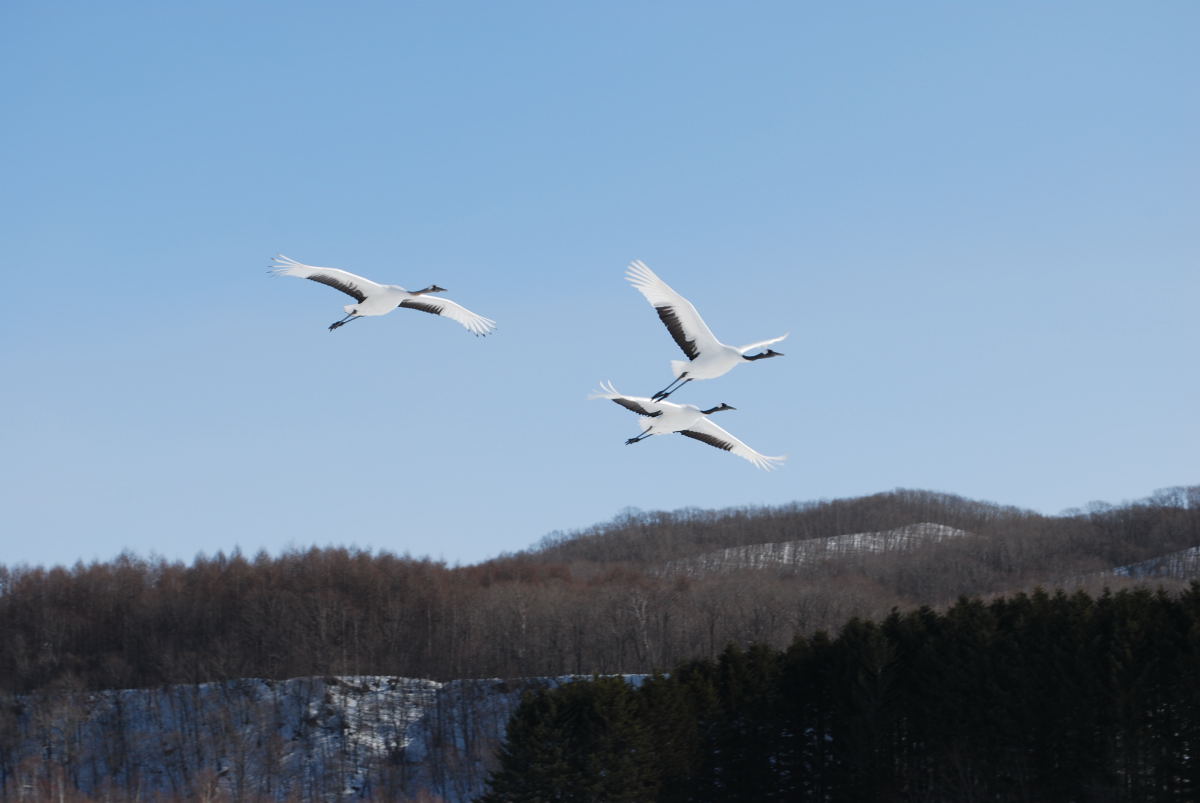 晴天に恵まれ、真っ青な空をバックに優雅に羽ばたくタンチョウ。何と美しい風景だろう。