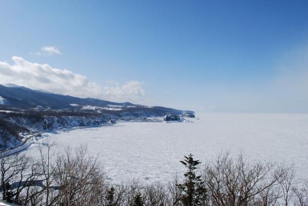 2月13日、流氷接岸3日目、快晴。10時過ぎに、宿泊先の知床プリンスホテル風なみ季を出発し、雪に覆われるウトロの町と一面と流氷が広がるオホーツク海を左手に、緩やかな上り坂の山道を走行する。