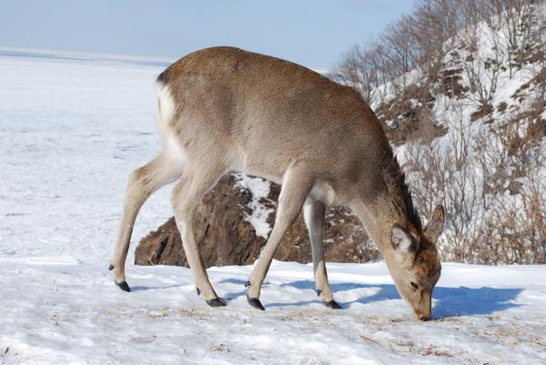 「フレペの滝コース」とは、知床自然センターから海岸断崖上の展望台までのコース。知床自然センターからしばらくは明るい森の雪道を歩き、その先はだーと開けた雪原になっている。雪原にはエゾ鹿の姿が見られる。快晴の中、真っ白な知床連山の山並みをバックに、眼下に広がるオホーツク海を一面と覆う流氷を眺める。