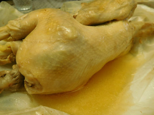 中国語「塩焗鶏」の「焗」という漢字は、通常「蒸し焼き」に訳されているが、必ずしも適切とはいえない。特に客家料理によく見られるが、蒸気を媒介として、出汁や塩漬けされた半熟の食材(「塩焗鶏」の場合、塩漬け)を加熱して仕上げる調理法だ。