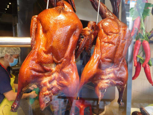 たらふく点心を食べたら、食料の仕入れだ。毎回決まっている。まず専門店「新揚威」の焼鴨(ローストダック)。この店のダックは3種類ある――普通焼き、当帰焼きとスモーク(燻製)焼き。今日は好物のスモークが売り切れで、普通焼を2羽包んでもらった。